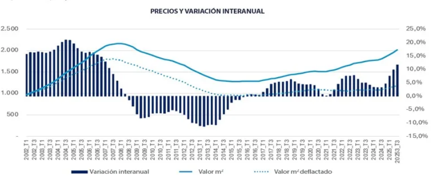 En el tercer trimestre de 2025, 23 municipios registraron incrementos de precio interanuales superiores al 10%, frente a 19 en el trimestre anterior, destacando Marbella (+18,3 %), Benidorm (+17,4 %), Vélez-Málaga (+16 %) y La Laguna, Jerez de la Frontera y Parla, todos en el entorno del 14 %.